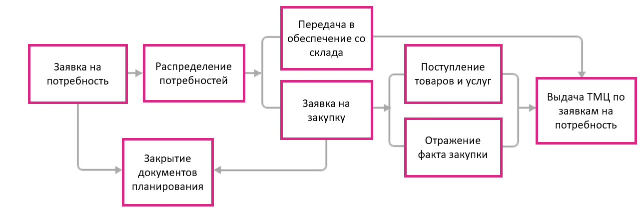 - Отражение факта закупки и выдачи ТМЦ по заявкам на потребность;