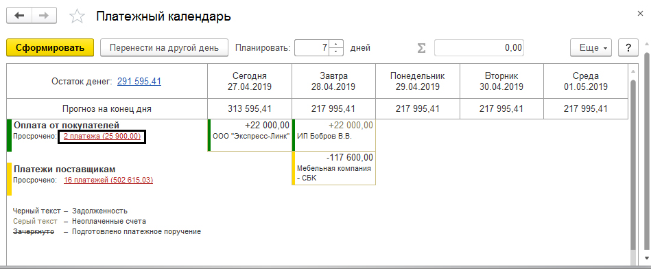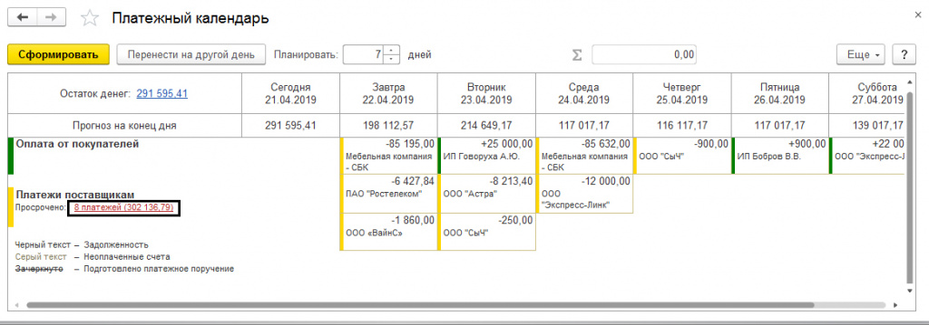 Стоит обратить внимание на следующий момент: для удобства пользователя и разделения задолженности, виды задолженности выделены разными цветами: зеленый – оплата от покупателей, желтым – платежи от поставщиков, красный и синий цвета – зарплата, налоги, взносы и иные обязательные платежи.