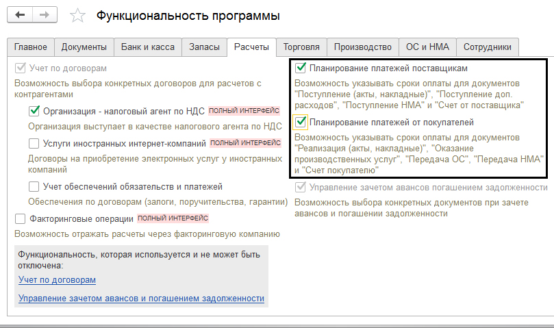 На вкладке «Расчеты» необходимо проверить наличие отметок в строках «Планирование платежей поставщикам», а также «Планирование платежей от покупателей». Если галочки отсутствуют – их нужно установить.