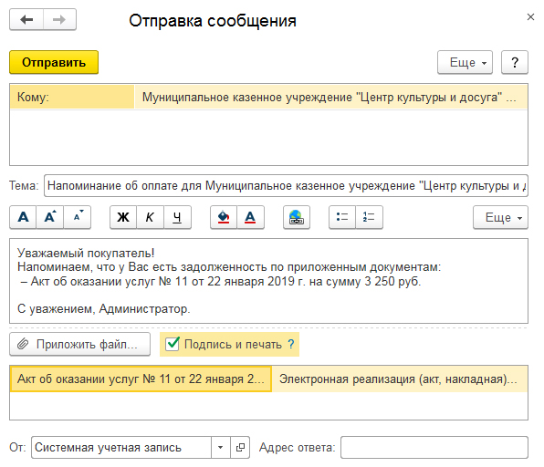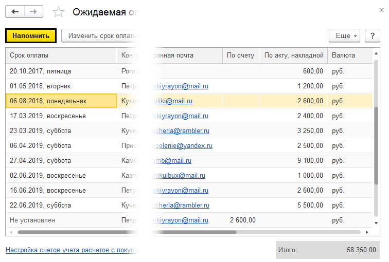 Кроме того, платежный календарь позволяет отправлять напоминание о необходимости оплаты покупателя, при условии, что в карточке контрагента указана его электронная почта. В этом случае при нажатии кнопки «Напомнить», будет автоматически сформировано электронное письмо для отправки контрагенту.