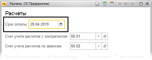 Еще один момент: сроки оплаты могут определяться договором – в этом случае в разделе «Расчеты» необходимо установить галочку в строке «Установлен срок оплаты».