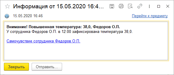 Если работник укажет, что его температура тела поднялась свыше 38 градусов Цельсия, ответственное лицо незамедлительно увидит соответствующее сообщение – с точными данными и ссылкой на измерения работника.