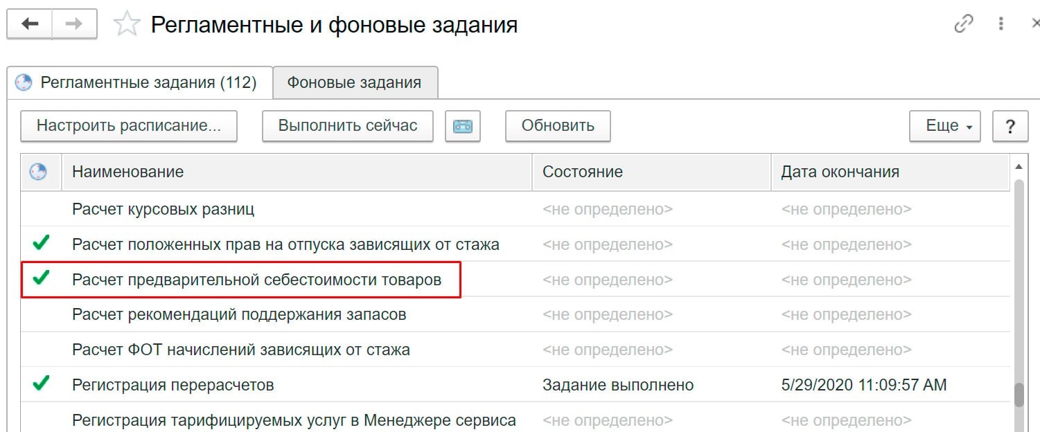 Для расчета вручную необходимо перейти по другому пути - "НСИ и администрирование" – "Администрирование" – "Обслуживание" – "Регламентные операции" – "Регламентные и фоновые задания" – "Расчет предварительной себестоимости" - "Выполнить сейчас".