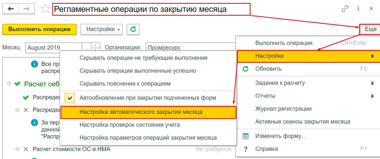 Осуществить "Закрытие месяца" и задать расписание можно в автоматическом режиме. Для этого необходимо найти соответствующую настройку
